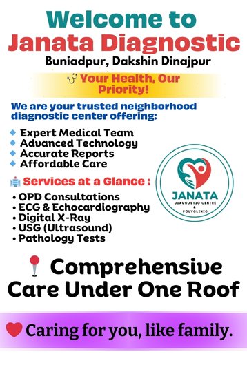 Whether you need routine health check-ups, specialized diagnostic tests, or expert medical consultations, we ensure a personalized and comfortable experience for every patient. At Janata Diagnostic Centre & Poly Clinic, your health is our top priority, and we strive to make quality healthcare accessible, affordable, and reliable for all.